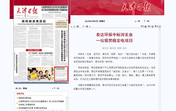 7月7日《天津日报》头版刊载了题为《泰达环保中标河北省一垃圾焚烧发电项目》的新闻报道,为泰达环保推动京津冀绿色发展、做强做大产业布局点赞。